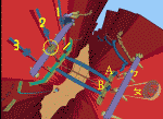 遇到索橋,往綠色箭頭處走去會到達一個觀景台,可以利用望遠鏡觀看水庫的管道分佈;往紅色箭頭處去,可橫跨峽谷,經過數道階梯向下後會到達水庫管道的底端,水庫管道隔一段時間會洩洪,所以要把握時間向上爬否則會被沖回最底下;先進入由左數來第3個管道(C水道),一路向上爬。